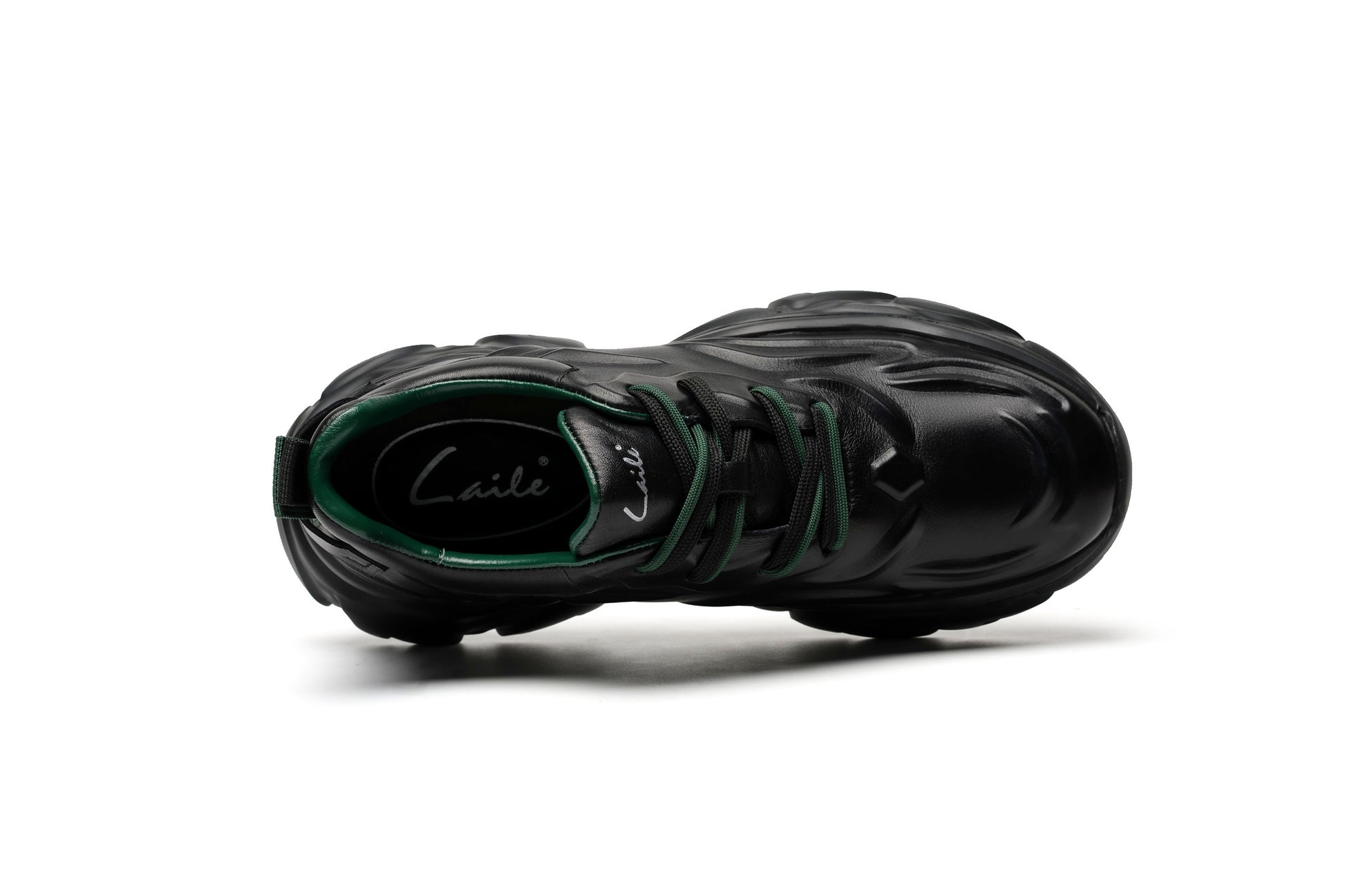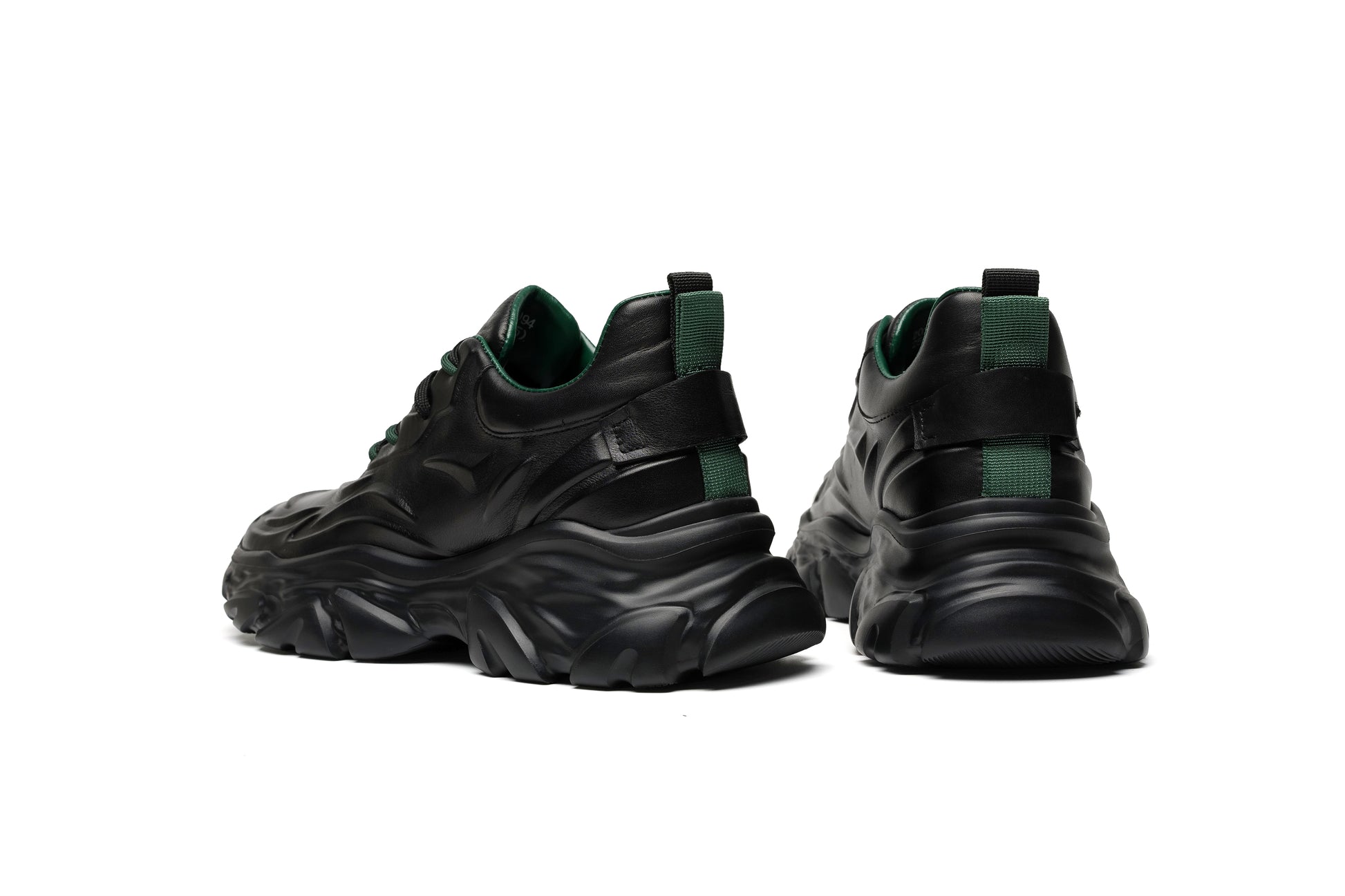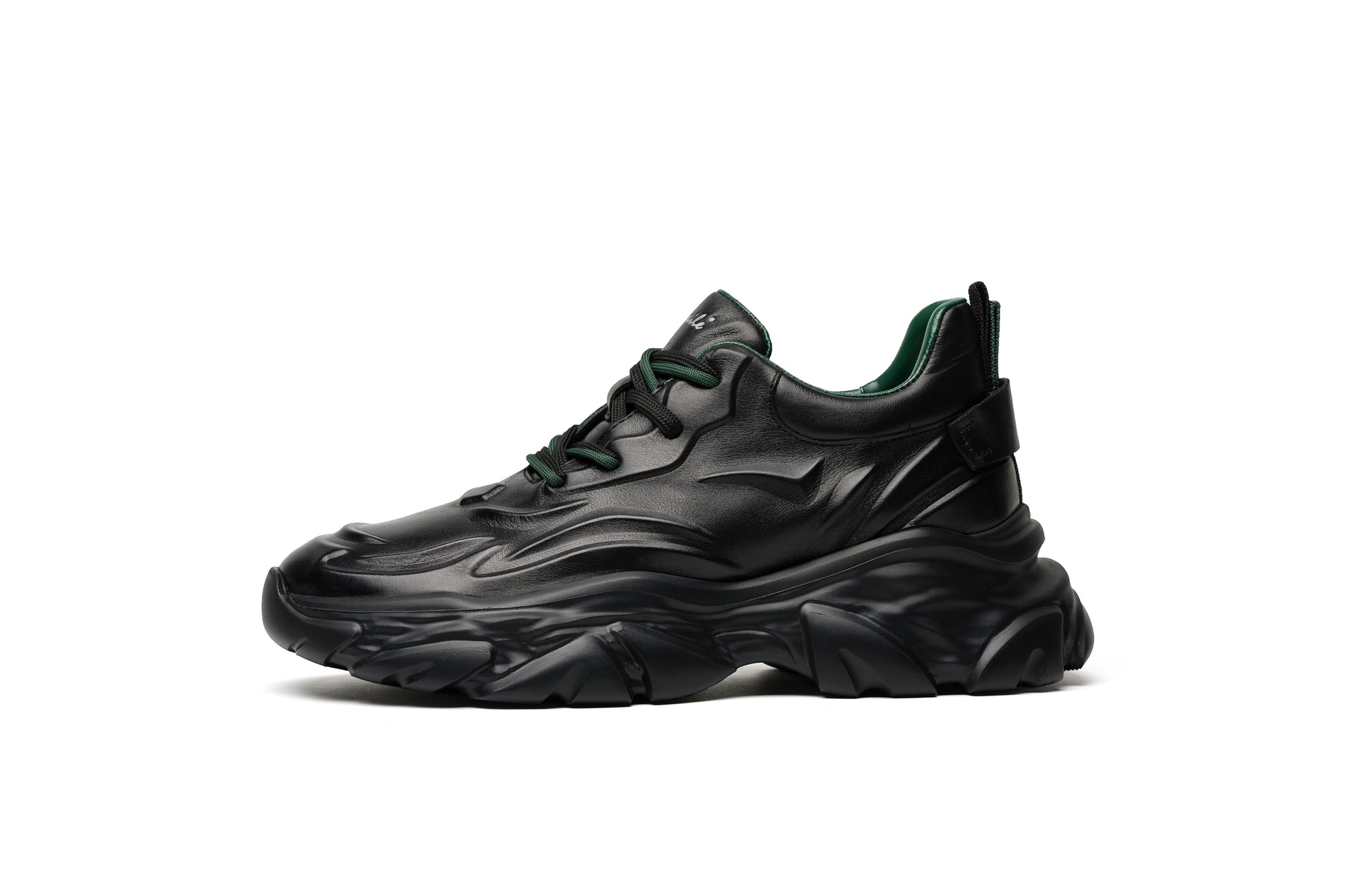Crafted from premium first-layer cowhide leather, the upper showcases smooth flowing contours that echo the rhythm of modern architecture. The matte-black finish and deep green lining create a refined yet powerful contrast — sleek, confident, and unmistakably bold.